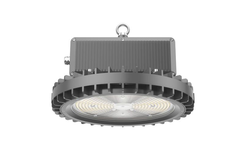 Luminaria diseñada para grandes alturas como hangares y pasillos logísticos con potencias hasta 480W. Cuenta con opciones de control vía sensores de movimiento y luz como fuentes de alimentación DALI. Su protección